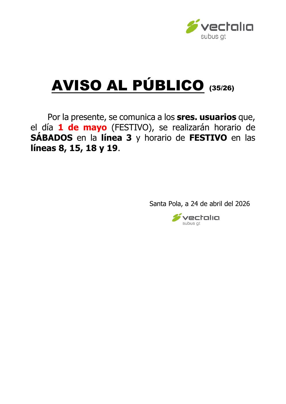 El dia 1 de mayo de 2026, el horario de la línea Santa Pola – Alicante será de sábado